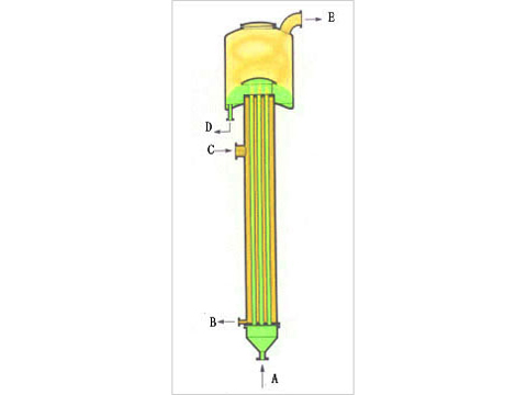 升膜式蒸發(fā)器又稱爬升膜蒸發(fā)器,它依據(jù)虹吸泵原理操作,根據(jù)在沸騰過(guò)程中產(chǎn)生的蒸汽氣泡的升力,液體和蒸汽并流向上流動(dòng),同時(shí),產(chǎn)生的蒸汽量增加,從而,在管壁上產(chǎn)生流動(dòng)的膜,即液體向上“爬”。并流向上運(yùn)動(dòng)有肋于在液體中產(chǎn)生高度的湍流。